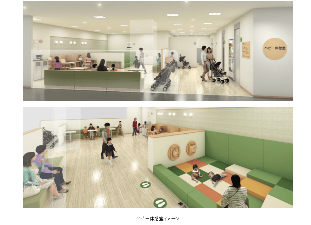 但真正讓我驚豔的是它全新升級的「ベビー休憩室」(嬰兒休息室)。裡面不但有寬敞的哺乳室(4間女性專用,還有一間是爸爸也能一起進去的「家庭哺乳室」!)、提供溫水的調乳區、放著兒童椅和微波爐的離乳食區,甚至還規劃了一塊讓寶寶爬行的「はいはいエリア」(爬行區)。