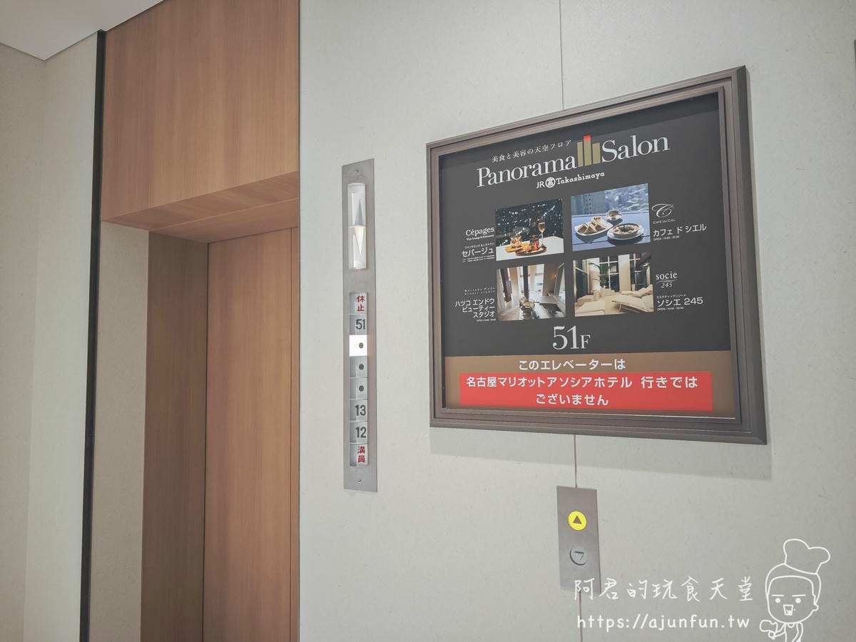 - A: 在JR名古屋高島屋,先搭電梯到12或13樓餐廳街,再換專用電梯到51樓。指標算清楚,但第一次去可能會有點小迷路,跟著「Panorama Salon」的指標走就對了。