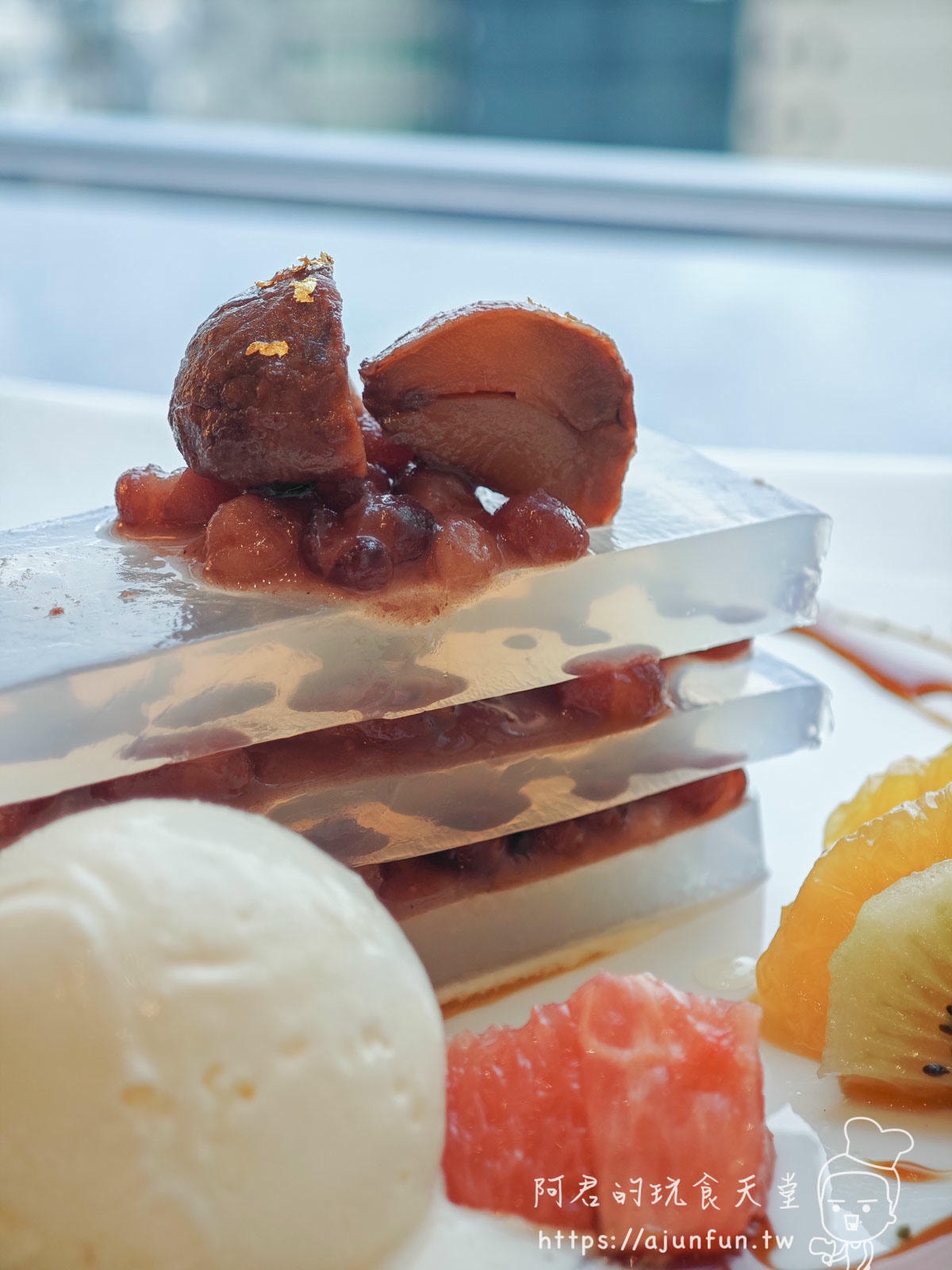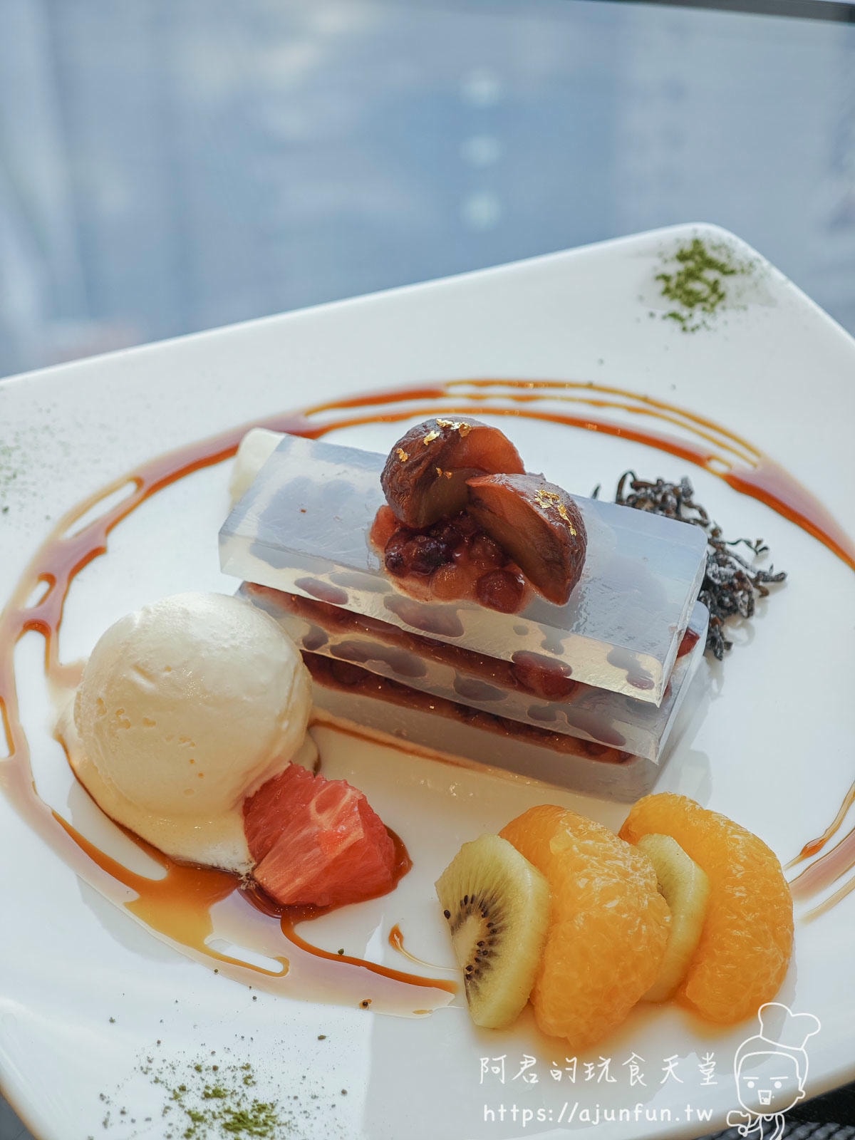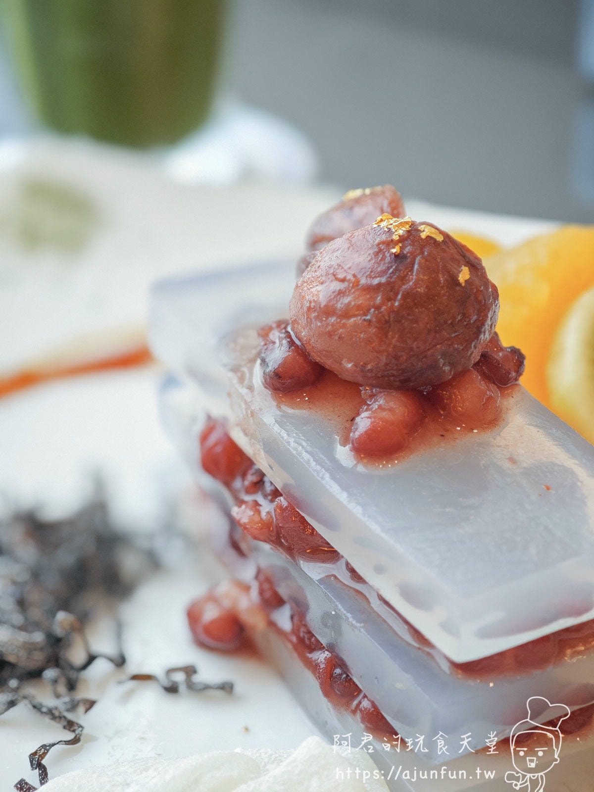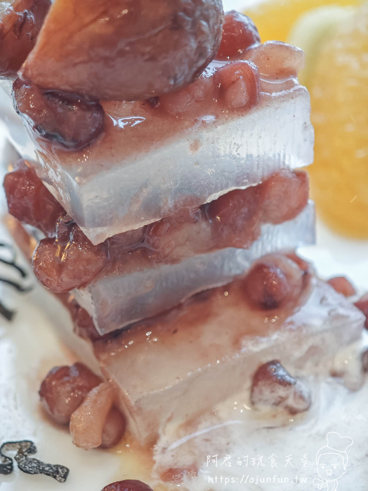 主廚把綿密的紅豆泥,跟冰涼又Q彈的寒天方塊,像蓋房子一樣,精緻地交錯堆疊成三層。